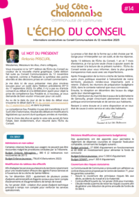 La CC Sud Côte Chalonnaise édite une publication institutionnelle consécutivement aux conseils communautaires. L'Echo du Conseil compile les informations essentielles et les décisions actées. Bonne lecture!